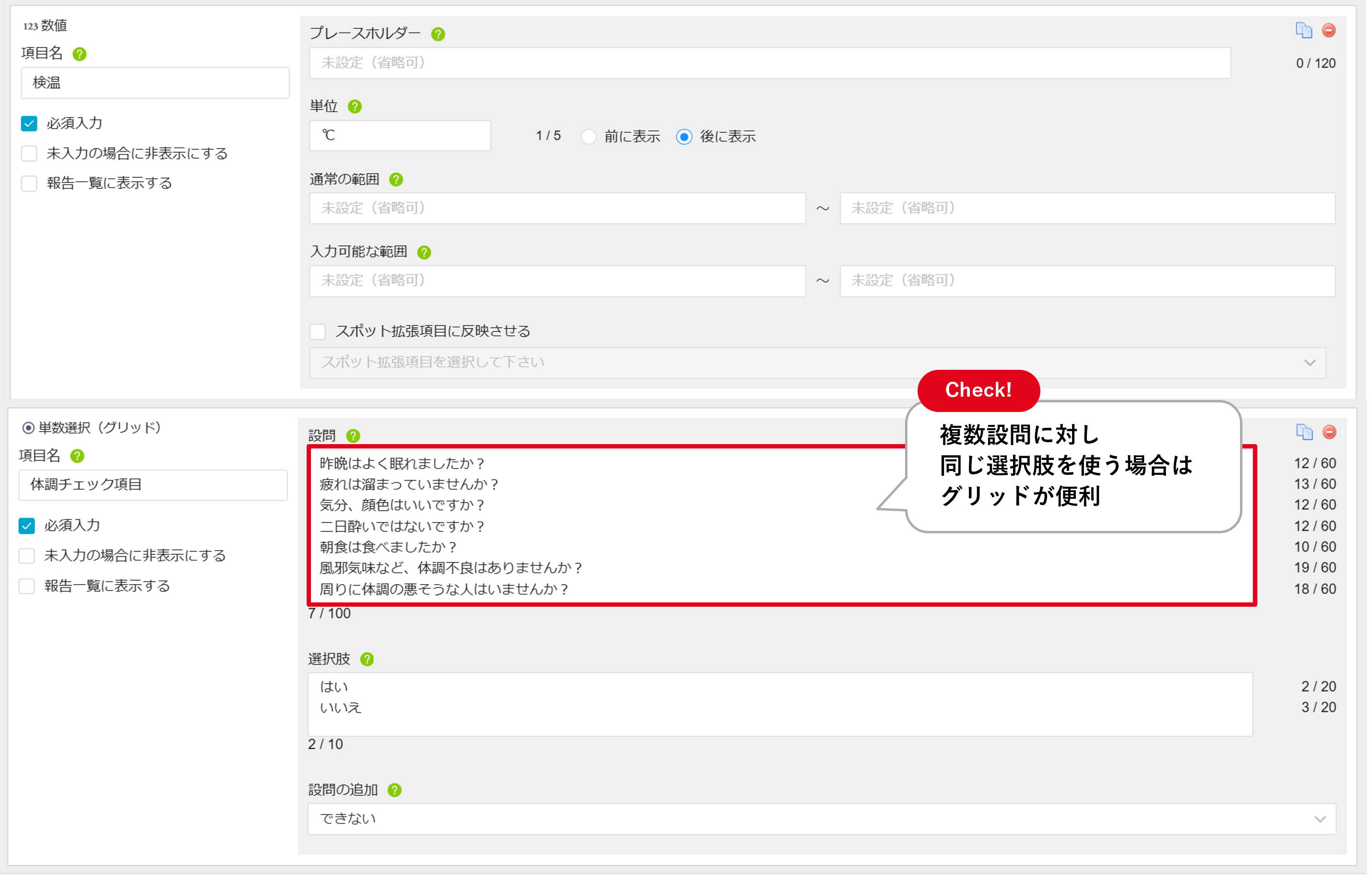 単数選択(グリッド)では、選択肢が共通する設問を複数作成することができます。