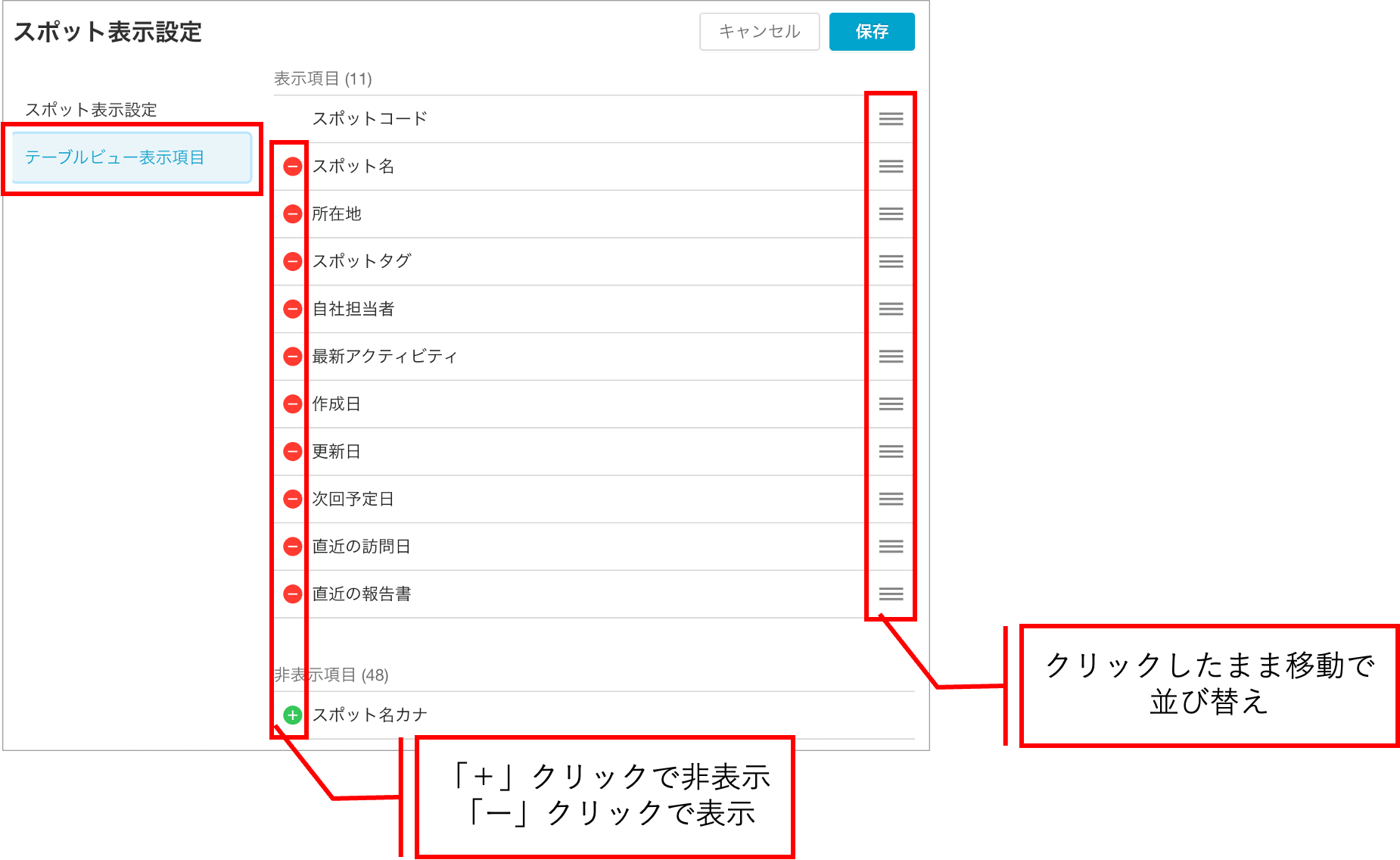 テーブルビューの時に表示する項目を選択したり、並び替えたりすることができます。