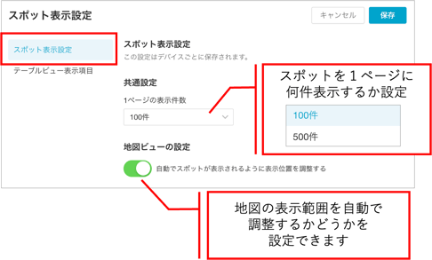 スポット画面の1ページの表示件数や、地図ビューの設定を行います。