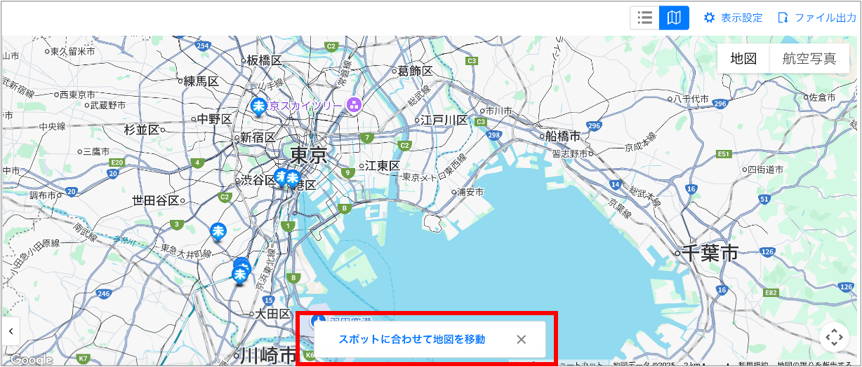 💡 どちらの設定の場合でも、地図上に表示されていないスポットがあるときは画面下部に 「スポットに合わせて地図を移動」 ボタンが表示されます。
