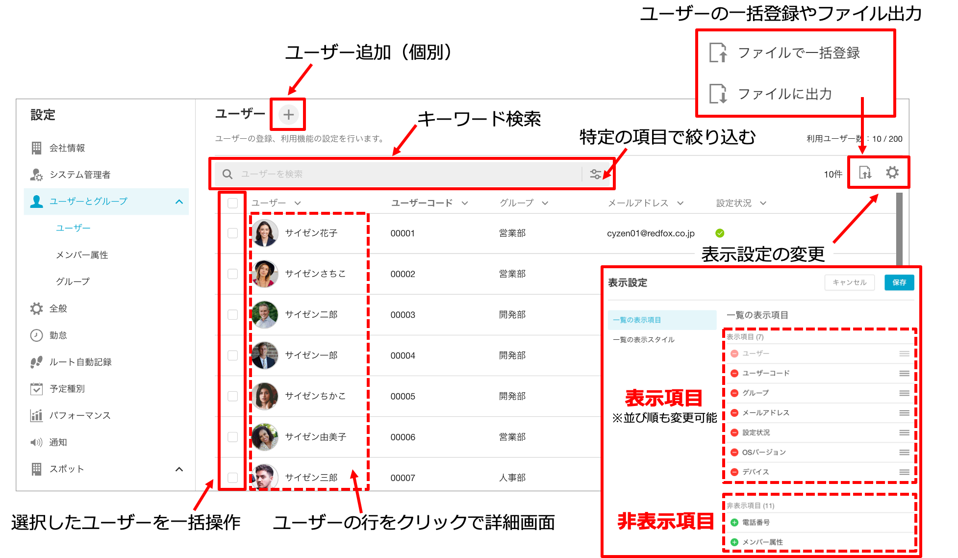 ユーザー画面の説明 説明対象者:システム管理者、グループ管理者 ユーザー画面は、管理サイト画面上部のメニューバーにある「設定」をクリックし、設定画面左の「ユーザー」をクリックします。 ユーザー画面 ユーザー詳細画面 契約数の確認 ユーザー画面 ユーザー追加やファイル出力など、一部機能はシステム管理者のみ表示されます。 ※画像はクリックで拡大できます 各項目名横の「∨」をクリックすると、ユーザーの並び順を変更することができます。 ユーザー詳細画面 契約数の確認 ユーザー管理画面では、システム管理者は契約ユーザー数と利用ユーザー数を確認することができます。